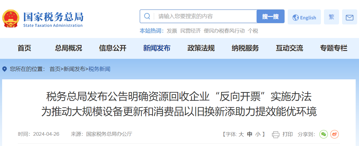 稅務(wù)總局發(fā)布公告明確資源回收企業(yè)“反向開票”實施辦法