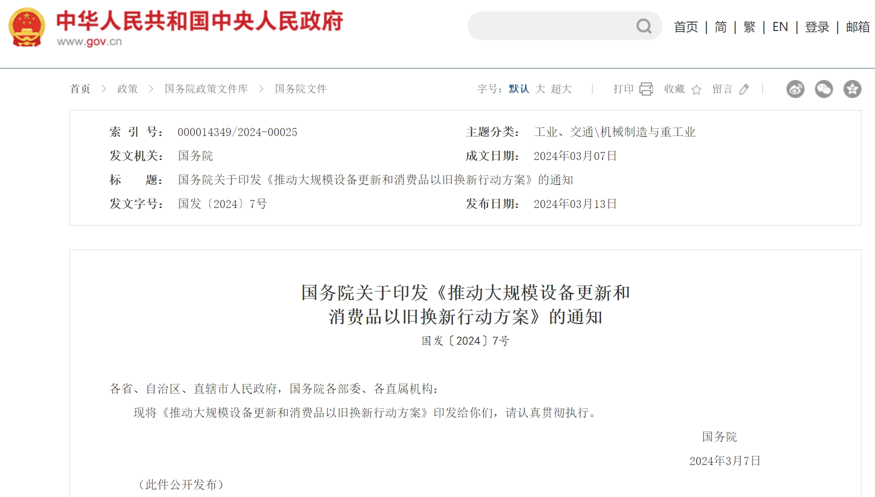 *********關(guān)于印發(fā)《推動大規(guī)模設(shè)備更新和消費品以舊換新行動方案》的通知