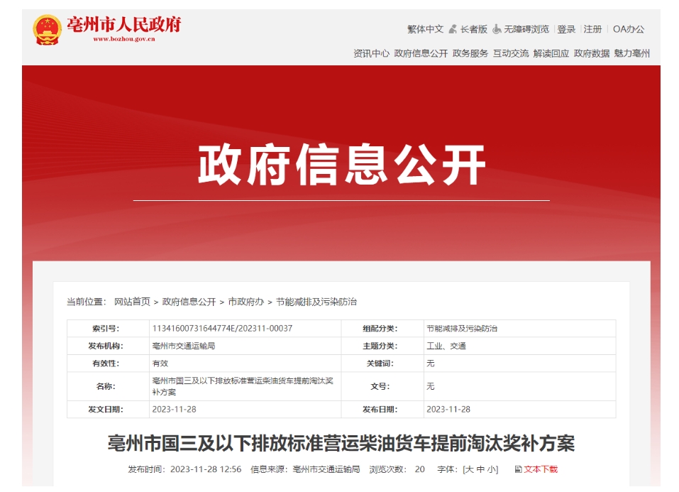 安徽省亳州市國(guó)三及以下排放標(biāo)準(zhǔn)營(yíng)運(yùn)柴油貨車(chē)提前淘汰獎(jiǎng)補(bǔ)方案