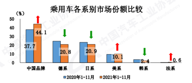 11月,中國品牌乘用車仍處于向上發(fā)展的區(qū)間,無論是銷量還是市場份額都在持續(xù)增長,已經(jīng)連續(xù)8個月保持增長。11月,中國品牌銷量達(dá)到了102.2萬輛,同比增長7.2%;市場份額上升了5.2個百分點(diǎn),來到46.6%。