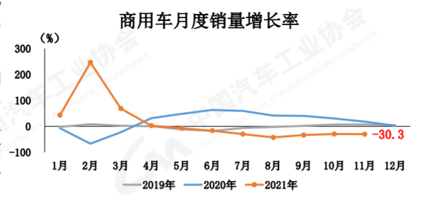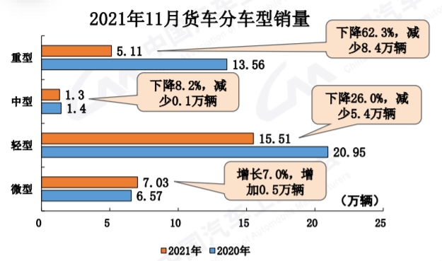 11月,商用車產(chǎn)銷分別完成35.3萬輛和33.0萬輛,環(huán)比分別增長3.2%和1.1%;同比分別下降31.9%和30.3%,降幅比10月分別擴(kuò)大5和0.6個百分點(diǎn)。與2019年同期相比,商用車產(chǎn)銷同比下降18%和17.6%,降幅比10月分別擴(kuò)大13.7和8.7個百分點(diǎn)。中汽協(xié)副秘書長陳士華強(qiáng)調(diào),受國六排放標(biāo)準(zhǔn)切換、“藍(lán)牌輕卡”政策預(yù)期帶來的消費(fèi)觀望、房地產(chǎn)開發(fā)行業(yè)較冷以及前期政策紅利逐步減弱等因素影響,下半年商用車市場需求弱于上半年。