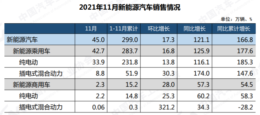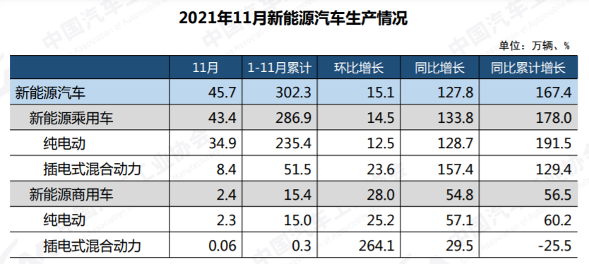 1-11月,新能源汽車產(chǎn)銷分別完成302.3萬輛和299萬輛,同比均增長1.7倍;市場滲透率達(dá)到12.7%,高于前10月。11個月的時間,新能源汽車銷量就達(dá)到299萬輛,表明我國新能源汽車行業(yè)已經(jīng)由政策驅(qū)動轉(zhuǎn)向市場拉動。