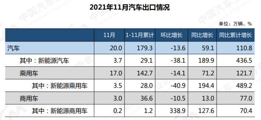11月,汽車出口量雖然較上月有所下降,但仍達(dá)到20萬輛,同比增長了59.1%,我國的汽車出口市場仍處于上升區(qū)間。其中,新能源汽車本月的出口貢獻(xiàn)率達(dá)到了32.9%。1-11月,汽車企業(yè)出口179.3萬輛,同比增長1.1倍。中汽協(xié)副總工程師許海東表示,隨著中國品牌乘用車海外戰(zhàn)略的不斷推進(jìn),中國品牌出口有望表現(xiàn)得越來越好。