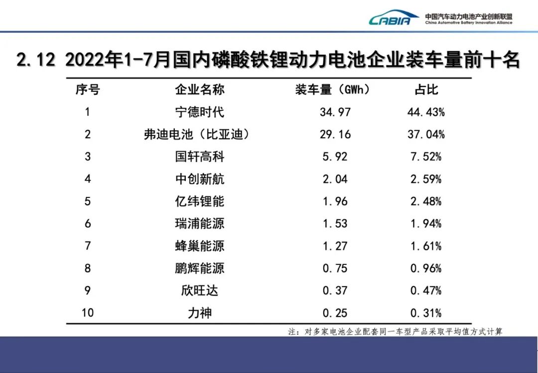 產(chǎn)量方面:7月,我國動力電池產(chǎn)量共計47.2GWh,同比增長172.2%,環(huán)比增長14.4%。其中三元電池產(chǎn)量16.6GWh,占總產(chǎn)量35.1%,同比增長107.7%,環(huán)比下降9.4%;磷酸鐵鋰電池產(chǎn)量30.6GWh,占總產(chǎn)量64.8%,同比增長228%,環(huán)比增長33.5%。1-7月,我國動力電池累計產(chǎn)量253.7GWh,累計同比增長175.6%。其中三元電池累計產(chǎn)量99.5GWh,占總產(chǎn)量39.2%,累計同比增長121.9%;磷酸鐵鋰電池累計產(chǎn)量153.8GWh,占總產(chǎn)量60.6%,累計同比增長227.1%。裝車量方面:7月,我國動力電池裝車量24.2GWh,同比增長114.2%,環(huán)比下降10.5%。其中三元電池裝車量9.8GWh,占總裝車量40.7%,同比增長80.4%,環(huán)比下降15.0%;磷酸鐵鋰電池裝車量14.3GWh,占總裝車量59.3%,同比增長147.2%,環(huán)比下降7.0%。1-7月,我國動力電池累計裝車量134.3GWh, 累計同比增長110.6%。其中三元電池累計裝車量55.4GWh,占總裝車量41.3%,累計同比增長55.7%;磷酸鐵鋰電池累計裝車量78.7GWh,占總裝車量58.6%,累計同比增長180.9%,呈現(xiàn)快速增長發(fā)展勢頭 7月,我國新能源汽車市場共計37家動力電池企業(yè)實現(xiàn)裝車配套,較去年同期減少8家。排名前3家、前5家、前10家動力電池企業(yè)動力電池裝車量分別為19.0GWh、20.9GWh和23.2GWh,占總裝車量比分別為78.5%、86.3%和95.9%。1-7月,我國新能源汽車市場共計45家動力電池企業(yè)實現(xiàn)裝車配套,較去年同期減少8家,排名前3家、前5家、前10家動力電池企業(yè)動力電池裝車量分別為103.6GWh、113.5GWh和127.3GWh,占總裝車量比分別為77.1%、84.5%和94.8%。