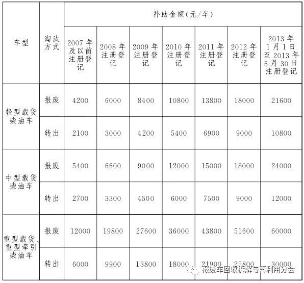 2017年9月21日至2019年9月20日期間,報(bào)廢或轉(zhuǎn)出高排放老舊柴油貨運(yùn)車可享受政府補(bǔ)助。其中,報(bào)廢車輛需在報(bào)廢期限前1年及以上進(jìn)行報(bào)廢方可享受政府補(bǔ)助。報(bào)廢或轉(zhuǎn)出時(shí)間以公安交通管理部門提供的車輛檔案注銷或轉(zhuǎn)出時(shí)間為準(zhǔn)。